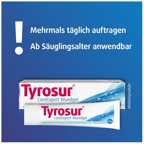 Tyrosur® CareExpert Wundgel ist zur Unterstützung während des natürlichen Wundheilungsprozesses bestimmt. Sollten sich Ihre Beschwerden verschlimmern oder keine Besserung eintreten, suchen Sie bitte Ihren Arzt oder Apotheker auf.